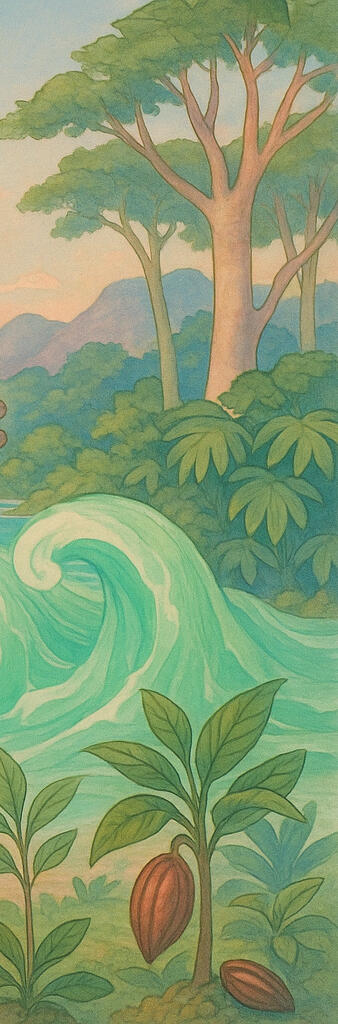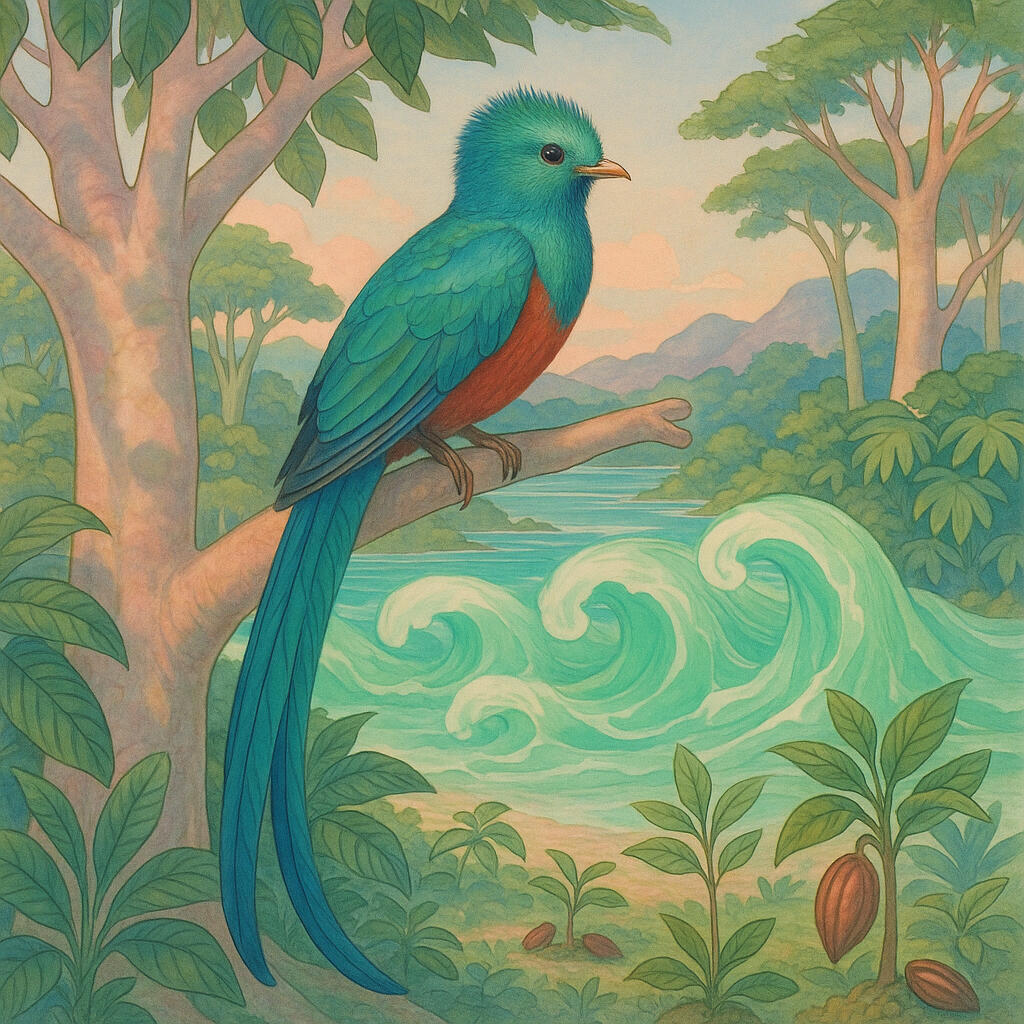 En la inmensidad de la selva Maya, entre columnas de ceibas y helechos gigantes, vivía un ave única: Xtak’ay. Su plumaje, un arcoíris de verde y azul, era discreto al sol, pero su canto lo cambiaba todo.Cuando Xtak’ay entonaba su melodía, algo mágico ocurría: el agua salada del mar se volvía jade, una gema viva que brillaba como esperanza líquida. Cada ola se transformaba en piedra verde y, al tocar la arena, se fragmentaba en diminutas semillas que brotaban sin aviso.En cuestión de horas, la orilla desierta se llenaba de plantas de cacao, cuyas vainas prometían un chocolate tan profundo y misterioso como la misma selva. Los antiguos sabios comprendieron entonces que no era un poder para dominar, sino un regalo para quienes supieran escuchar con humildad.Con Xtak’ay, aprendieron a respetar el equilibrio: el mar cede su fuerza al jade, el jade nutre la tierra y el cacao alimenta corazones. Y así, cada vez que un ave canta al amanecer, los mayas recuerdan que la verdadera magia está en mantener vivos la curiosidad, el respeto y el asombro.