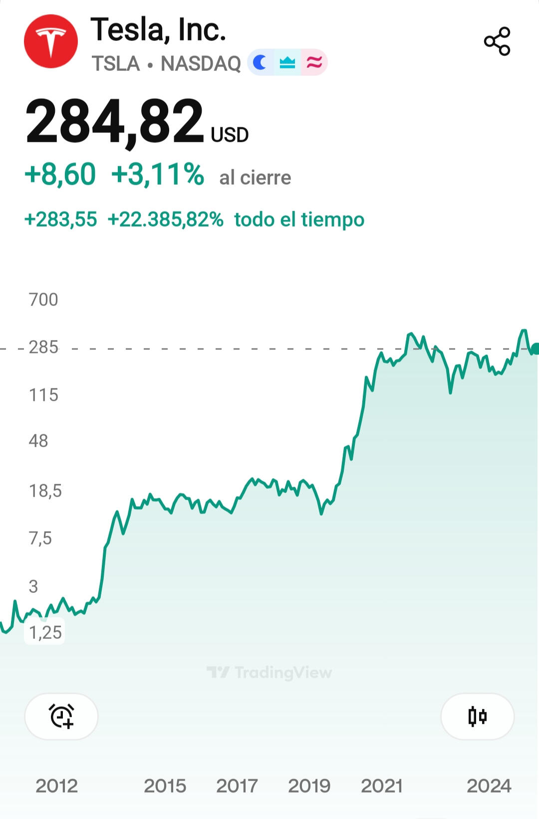 Miremos el gráfico completo de TSLA. Desde su salida a bolsa en 2010, la línea tiene altibajos, sí, pero la tendencia es claramente alcista. Lo que sucedió en diciembre de 2022 fue apenas un parpadeo en el radar.La narrativa del "fin de Tesla" ha aparecido más de 20 veces en la última década. Aún no ha sucedido. Cada caída ha sido, hasta ahora, una oportunidad de compra. No una sentencia de muerte.